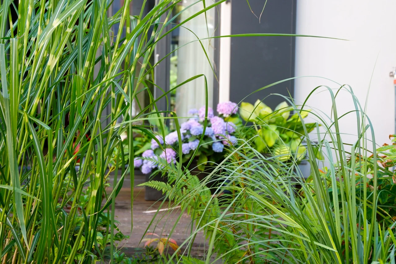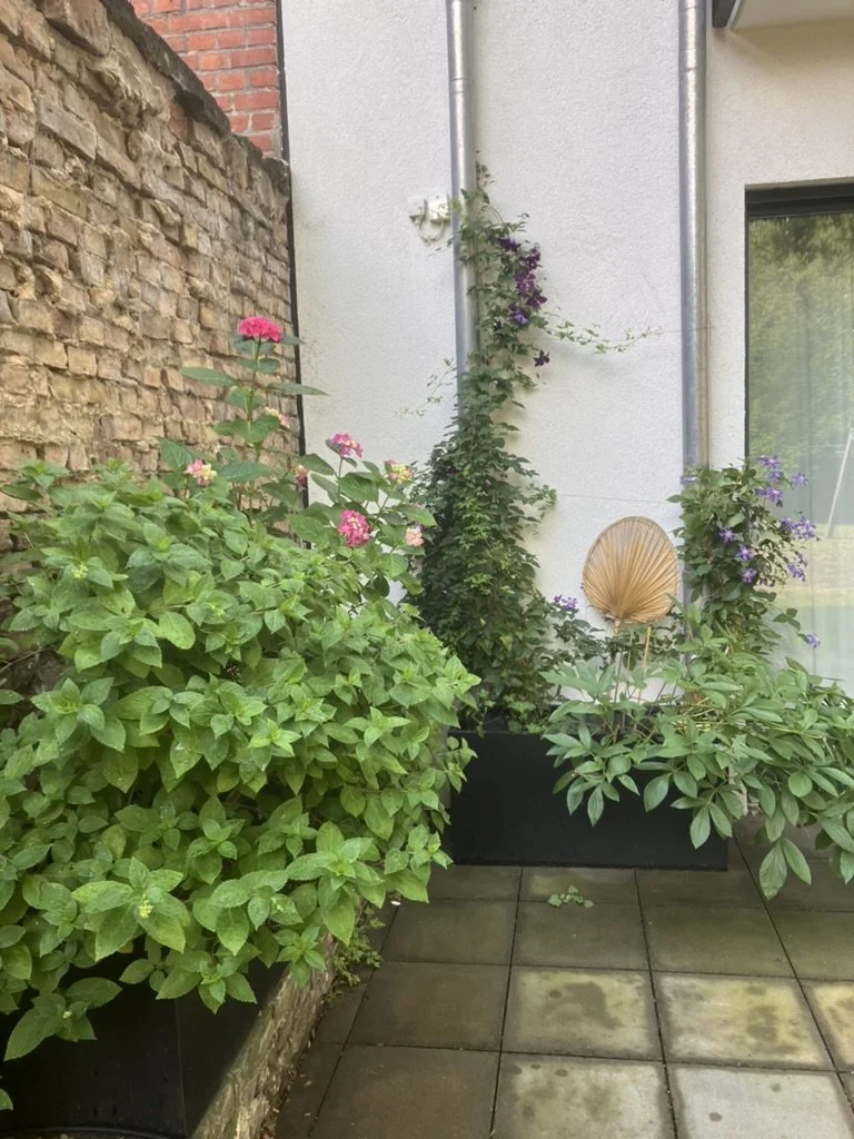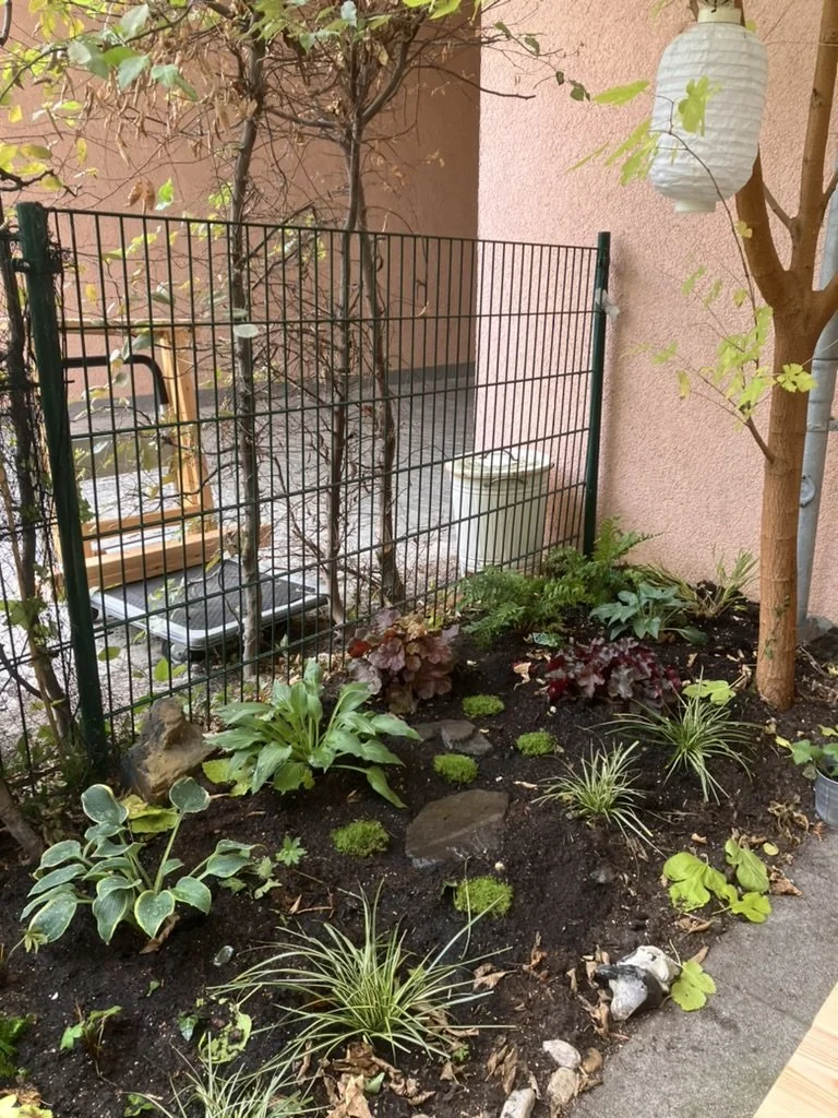 Terrasse und kleiner Schattengarten vor Erdgeschosswohnung